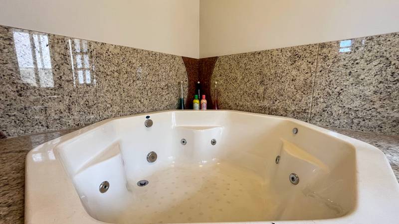2 quartos amplos com piso em tábua corrida, teto rebaixado, iluminação planejada, sendo a suíte com hidromassagem, box em blindex, espelho, bancada em granito e armários