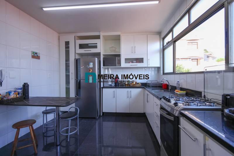 • Cozinha com armários planejados, bancada e piso em granito, oferecendo funcionalidade e durabilidade.