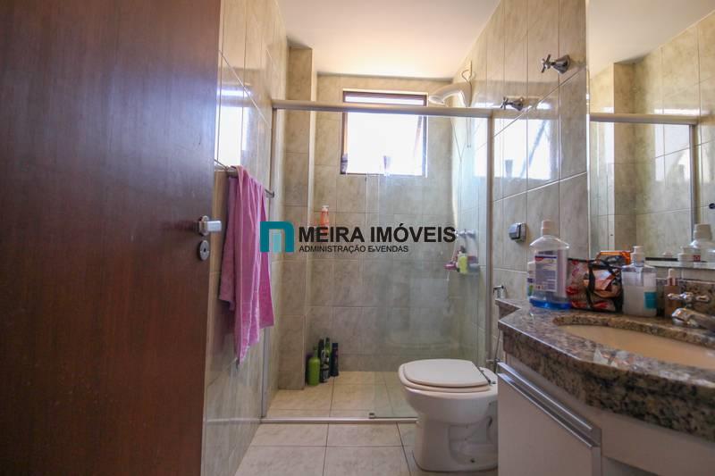 • Banheiro social com acabamento em cerâmica, armário planejado, espelho e box blindex.