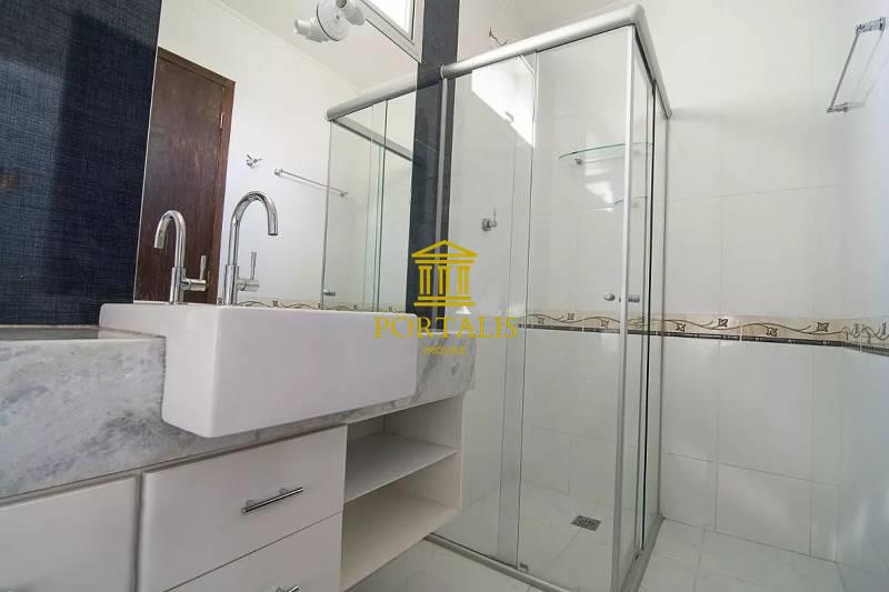 Banheiros (social e suíte) com revestimento em cerâmica, bancada em granito, armários e box em blindex.