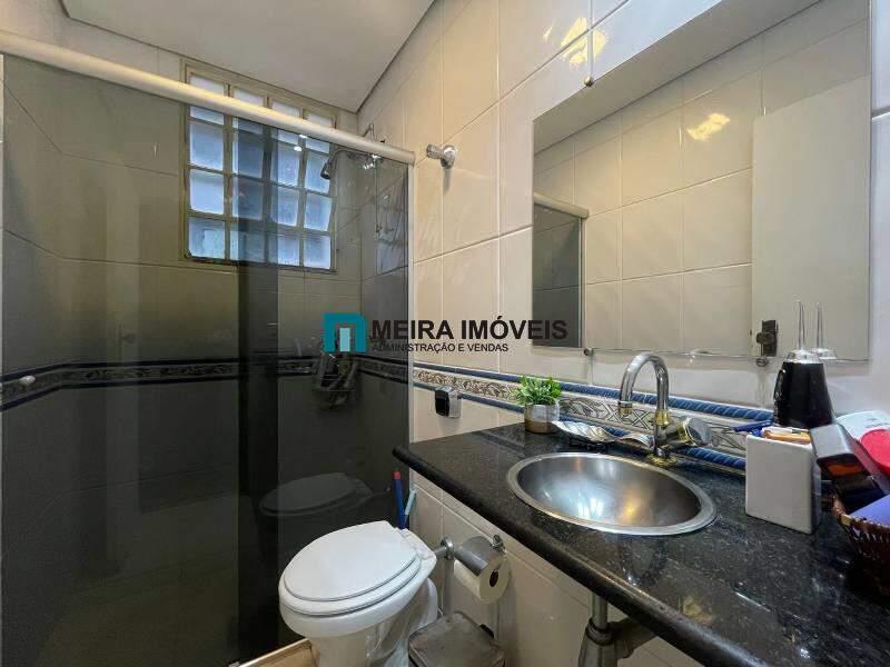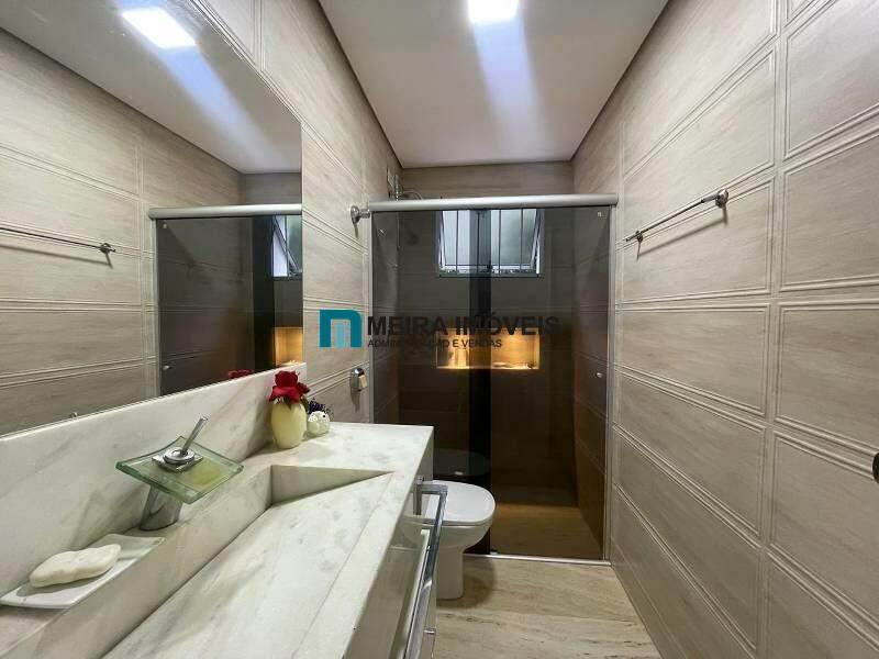 Banho social com excelente acabamento, espelho e box em blindex.
